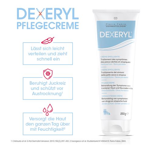 DEXERYL ist die medizinische Intensivpflege bei Hautkrankheiten wie Ichthyosis, Psoriasis und Neurodermitis und für die anspruchsvolle, trockene Haut von Diabetikern und Dialysepatienten. Außerdem bietet sie optimalen Schutz für trockene Haut – ob durch Veranlagung oder durch die Witterung. Cremen Sie einfach Gesicht und Körper ein- bis zweimal täglich, bei Bedarf auch häufiger, mit DEXERYL ein.