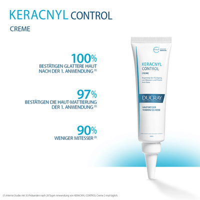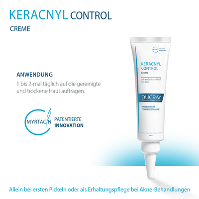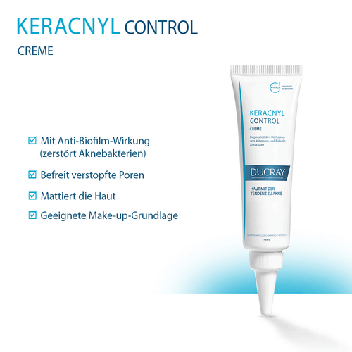 KERACNYL CONTROL Creme pflegt effektiv bei ersten Pickeln und Mitessern. Außerdem geeignet als Erhaltungspflege nach einer Akne-Behandlung. KERACNYL CONTROL begünstigt das Verschwinden von Mitessern und Pickeln.