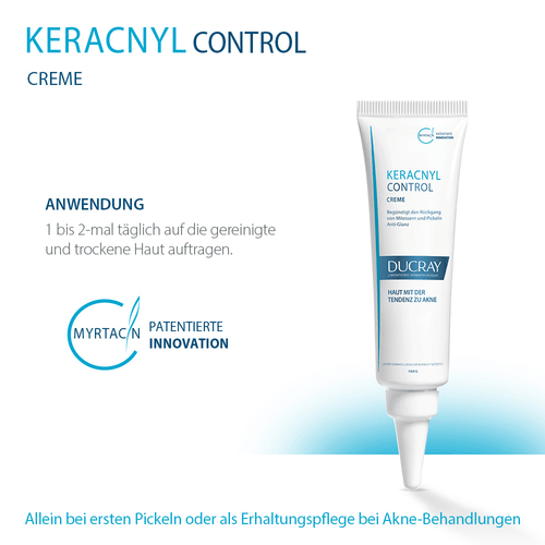 Die innovative Formel der KERACNYL CONTROL Creme wirkt auf die für Pickel verantwortlichen Bakterie. Mit Myrtacin Innovation: 2-fach Wirkung auf den C.acnes Biofilm: zerstört und verhindert Neubildung. Myrtacin hilft die für die Pickel verantwortlichen Bakterien zu bekämpfen, indem der Biofilm der Bakterien aufgelöst wird. Die Hydroxysäure löst sanft die verhornten Poren. Der Verbund aus Zinksalicylat/ Sabalextrakt reduziert überschüssigen Talg.