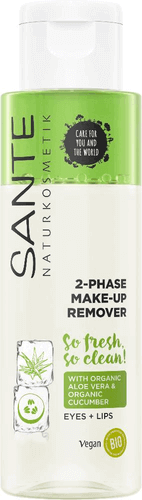 Der Sante 2-Phase Make-up Remover mit Bio-Aloe Vera & Bio-Gurke entfernt Make-up Reste mild & effektiv. Die Kombination aus wertvollen Bio-Ölen pflegt die Haut und hinterlässt einen erfrischenden Duft. Die nachhaltige Flasche ist aus 100% rPET mit einem Flip-Top Verschluss für eine einfache Handhabung. Vegane Formel + Flasche aus 100% rPET + Bio-Inhaltstoffe.