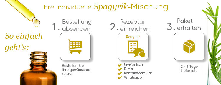 Die Bestellung einer individuellen Spagyrik-Mischung ist ganz einfach. Wählen Sie zu Beginn aus, ob wir bereits Ihre Rezeptur kennen. Dies ist der Fall, wenn Sie bereits Ihre Spagyrik-Rezeptur bei uns bestellt haben und keine Änderungswünsche dieser Rezeptur haben. Anschließend bestellen Sie einfach Ihre gewünschte Füllmenge und bezahlen Sie mit Ihrer bevorzugten Zahlungsmethode. Für den Fall, dass wir Ihre Rezeptur nicht kennen, übersenden Sie uns Ihre Rezeptur per E-Mail, Freiumschlag, Kontaktformular oder Whats App.